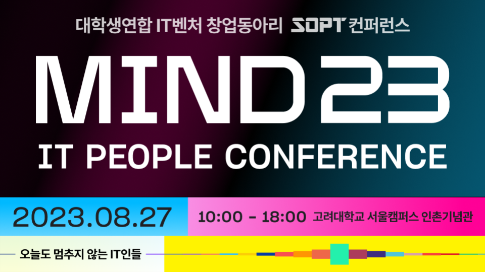 진짜 간만에 글을 쓰게 되었는데, 그동안 글을 못 쓴 이유는 (핑계처럼 들리겠지만 ㅋㅋㅎ) 너무 바빠서였다 ... 그 동안 어떻게 지냈냐면 대학생 창업 동아리 SOPT 32기에서 iOS 파트로 활동도 하고, 멋사도 (살짝 찍먹이긴 하지만 해야할건 다 하고 있다...ㅠ), 4-1 학기 수업도 듣고, SOPT 에서 앱잼에서 한 프로젝트 개발도 하고, 따로 프로젝트에 합류하게 된 개발 및 공부도 하고, RxSwift + MVVM 공부도 하고 (조만간 공부한거 올리지 않을까 싶음), 등등... 좀 바쁘게 지내고 있었다 ( 나름 ) • • • 사실 그렇게 흘러가면 흘러가는대로.. 블로그도 그냥 방치해 둔 상태로 지낼 수 있었는데 어짜다가 글을 쓰게 되었느냐.. SOPT 에서 연 컨퍼런스인 MIND23 에 다녀오고..