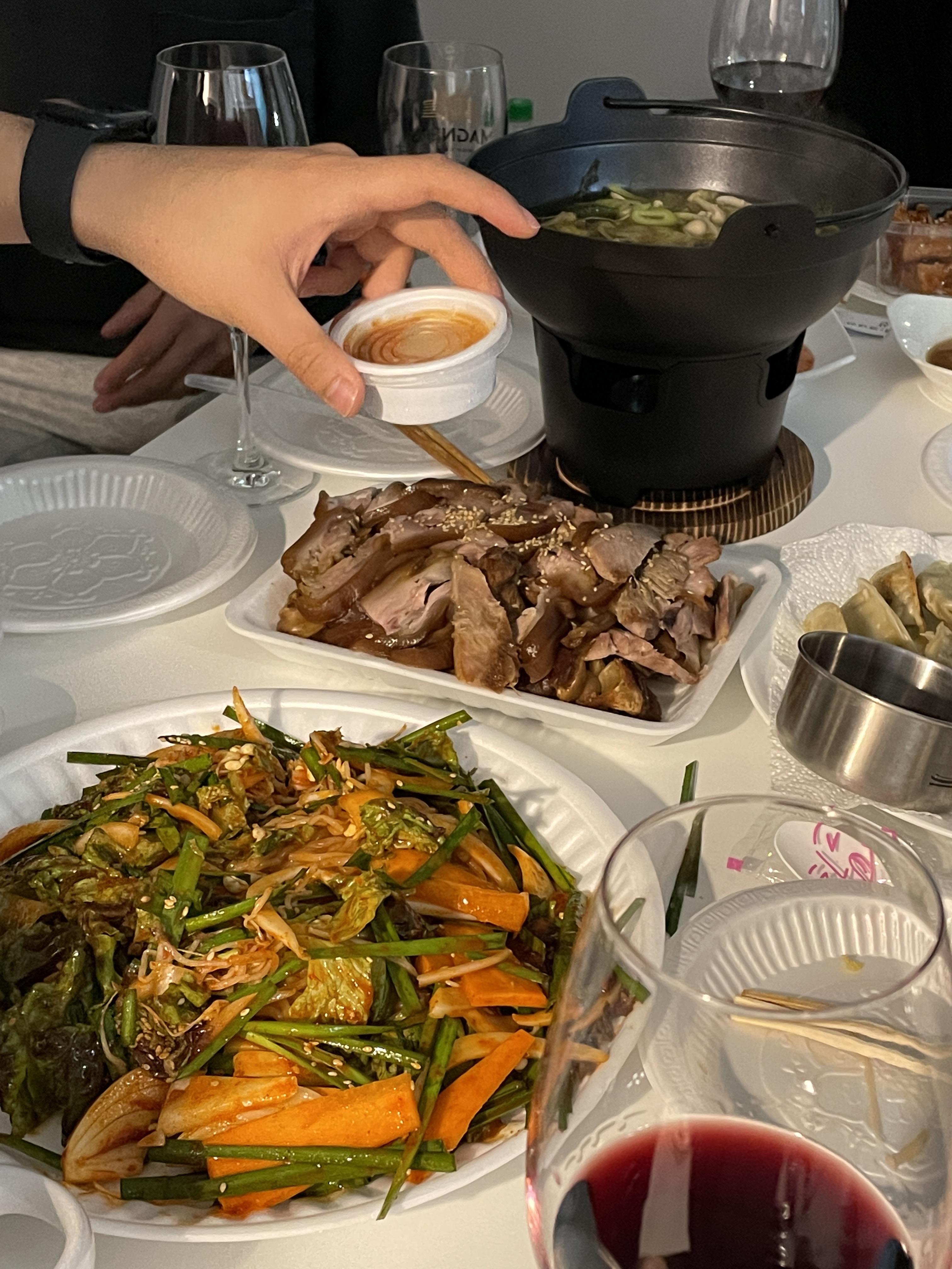 족발과 레드와인과 막국수와 사온 부챗살 저저 맨 위에는 뭐지 무튼 샤브샤브같은? 찌개를 1차로 먹고
