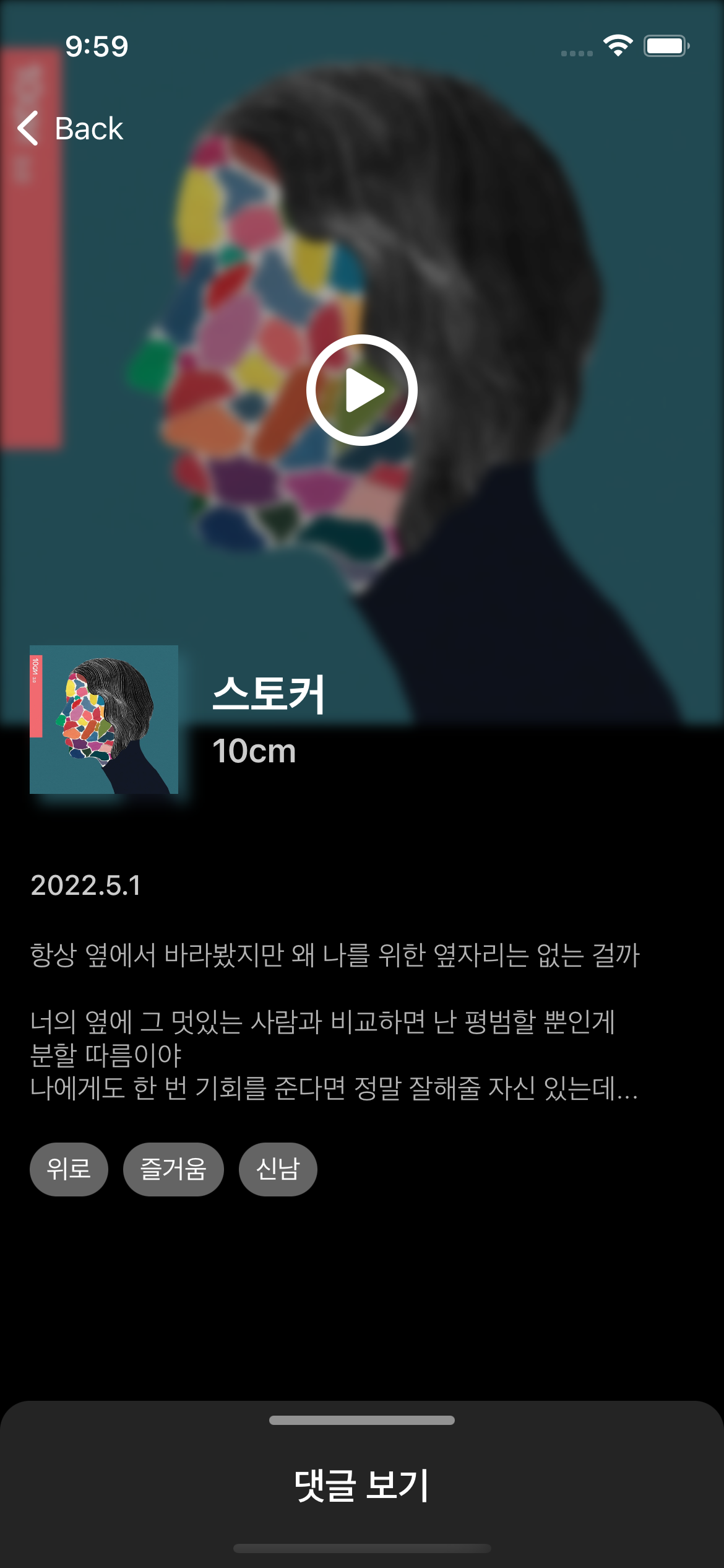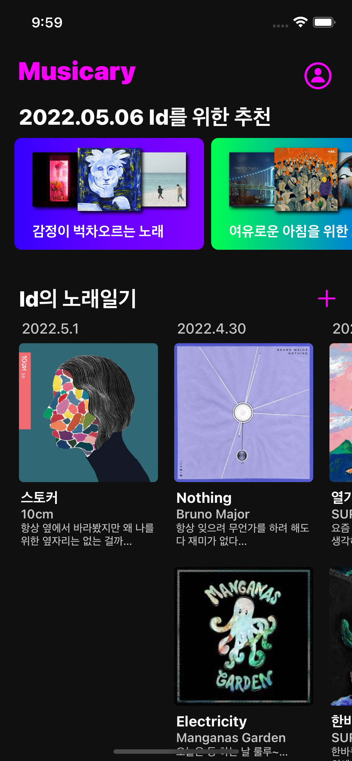 라는 의미로 음악을 좋아하는 나로서 음악을 들으며 떠오르는 생각이나 공감되는 감정을 기록할 수 있게 하는 앱이다